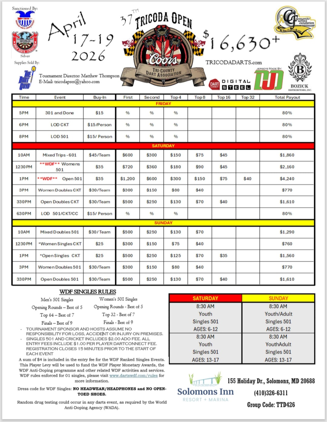 *Times given for all events are sign up times. Play starts 30 minutes after sign ups.